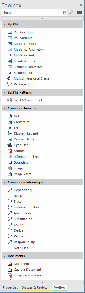 Within the Toolbox, related elements and connectors are organized into pages, each page containing the elements or connectors used for a particular type of diagram. The diagrams include standard UML diagrams, Enterprise Architect Extended diagrams, and diagrams customized for any MDG Technologies and Profiles that you have added to the system.