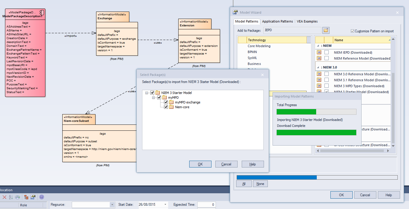 When you set up a project by importing models using the Model Wizard (Start Page 'Create from Pattern' tab), you can generate the model structures from Patterns that you select in the Wizard. Each Pattern can contain a number of Packages and sub-Packages, and it is possible to select which of these Packages to add to your model and which to omit, using the 'Select Packages' dialog.