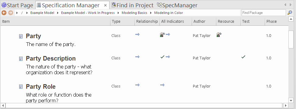 The Specification Manager is a document-based interface to a selected Package in the model, providing the means of creating and reviewing elements as text representations of model objects in that Package. You can rapidly define or edit properties of the elements in the Specification Manager window itself, and also immediately open a range of windows and dialogs to add or review further properties and characteristics specific to each element. A key feature of the Specification Manager is the speed and ease with which you can create, filter and review a large number of elements from one point, and develop or examine complex detail on each element or not, as you require.