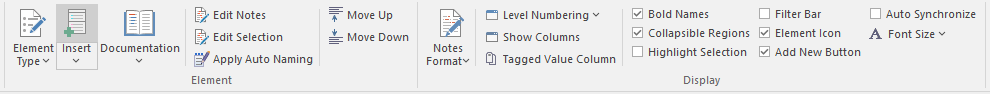The 'Element' panel offers a range of facilities for working with the elements that are displayed in the Specification Manager view. There are facilities for adding new elements and viewing and editing element properties.
