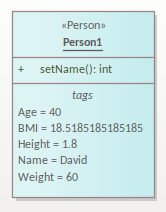 Here is an example of an element created using the 'Person' stereotype, that includes the BMI Scriptlet.