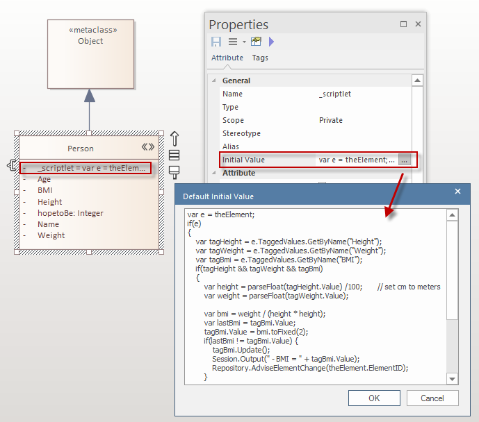 In this example, the element that defines the stereotype 'Person', defines (among other things) three attributes, 'Height', 'Weight' and 'BMI'. It also defines the special attribute '_scriptlet', that assigns a value to 'BMI', that is calculated as 'Weight' divided by the square of 'Height'.