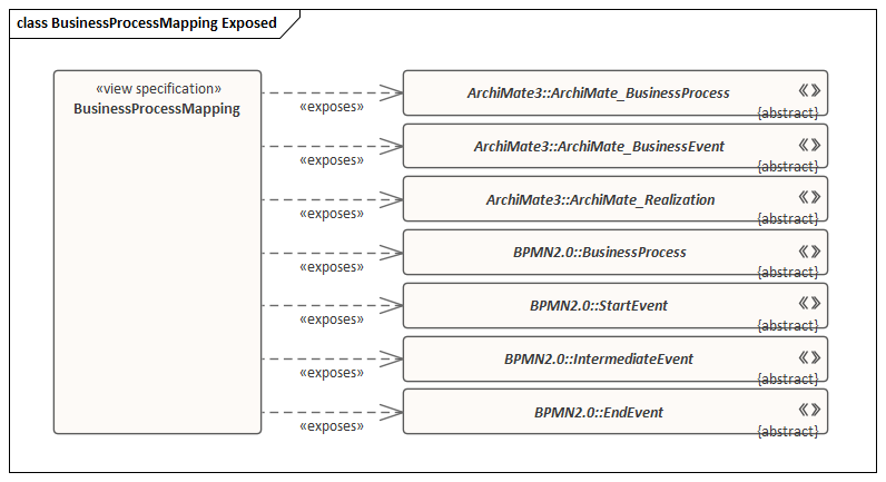 The elements appearing in a Viewpoint are defined by the Exposes relationships from the View Specification to the Stereotypes and UML Metaclasses to be included.