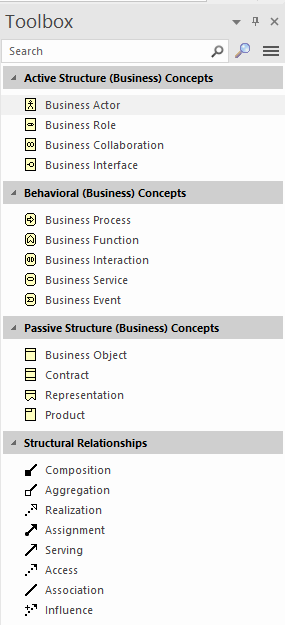 Figure: Showing the toolbox pages that list the available elements and relationships for the selected viewpoint.