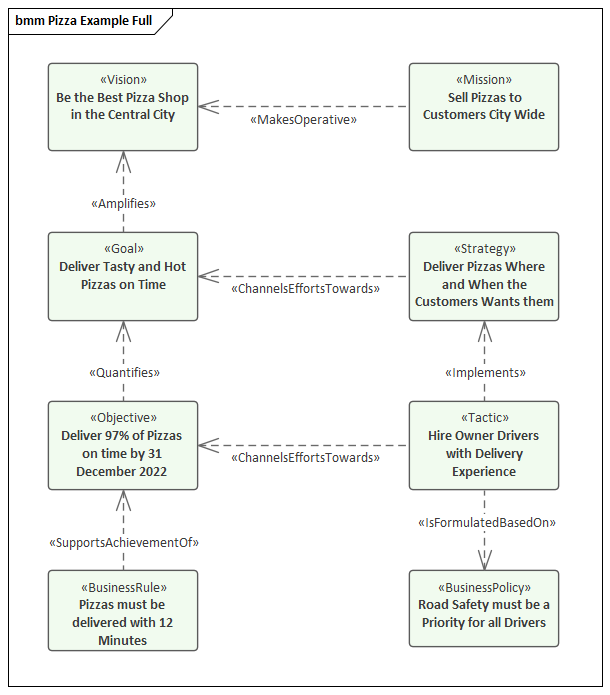 You can re-create a similar diagram from the 'BMM Example - Pizza Company' Pattern on the 'Business Motivation' page of the Model Wizard (Start Page 'Create from Pattern' tab).