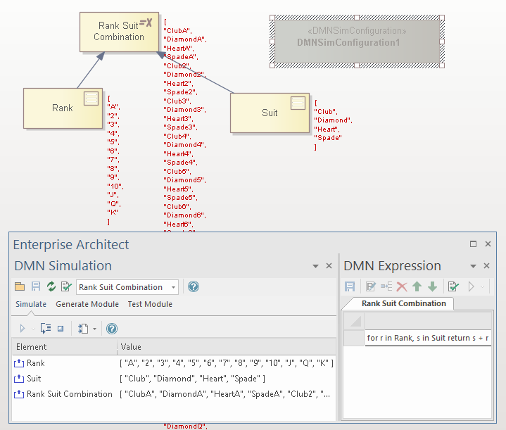 • Decision Rank Suit Combination is represented as a Literal Expression with a for loop: for r in Rank, s in Suit return s + r