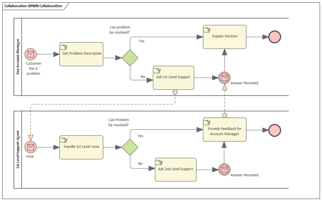 You can describe the messages that flow between two or more participants using Pools, where each pool in a Collaboration diagram represents a participant . Messages that are exchanged as part of the interaction are visualized as Message Flows between the pools. In a White Box collaboration the messages flows start with flow objects in one pool and target flow objects in another pool. In Black Box collaborations the message flows target the edge of the pool and the flow objects in the second pool are not represented.
