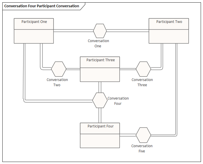 You can visualize a high level representation of groups of messages (conversations) transmitted between two or more participants in a domain using a Conversation diagram. The goal is to present a summary of the messages that flow between a group of participants in a domain. You group sets of messages into conversations thus hiding the complexity of the choreography of the underlying messages. The conversations (hexagonal elements) are connected to the participants that engage in the conversation. This creates an overview of how the participants interact together. Just as in human speech it is possible simply to say that two (or more) parties engaged in a conversation about a topic without going into the detail of what was said.