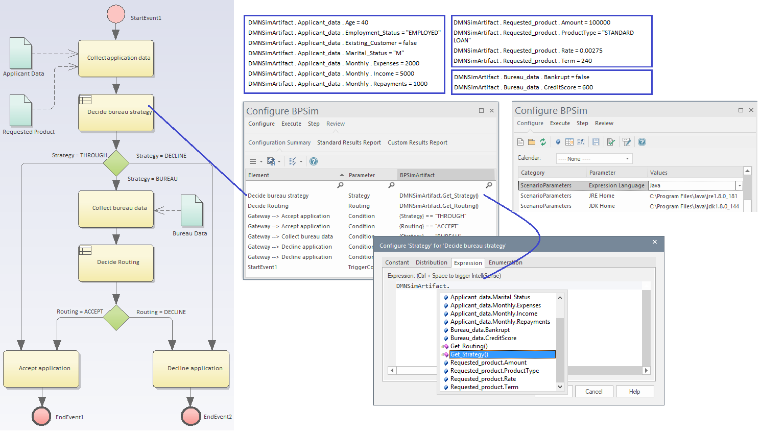 - The second Business Rules task 'Decide bureau strategy' is configured to set the property 'Strategy' to the value 'DMNSimArtifact.Get_Strategy()'; you don't need to type this in - press to help you edit the expression