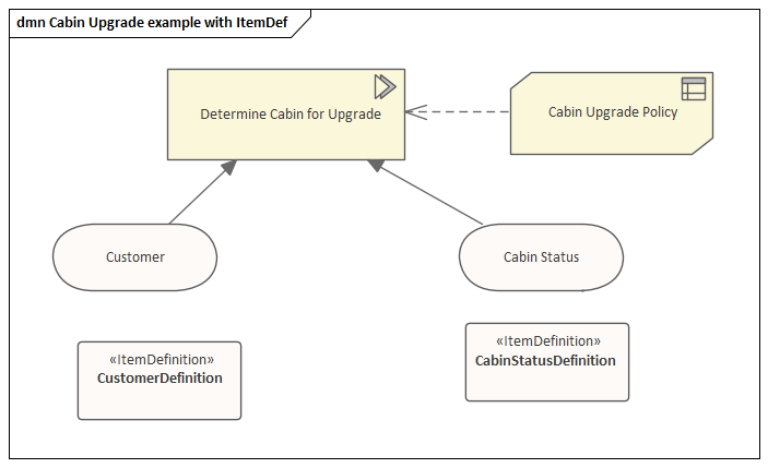 Draw an 'Information Requirement' connector from the decision 'Determine Cabin for Upgrade' to the input data 'Cabin Status'. |