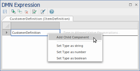 Double-click on the InputData element 'Customer'. The DMN Expression window displays. |