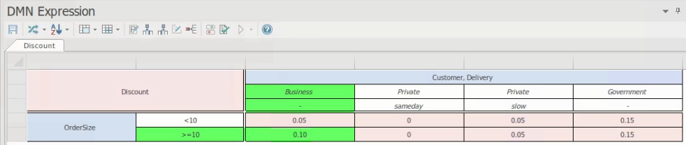 At the end of a simulation, in a Crosstab Decision Table, related input entries and output entries are highlighted. For example, in this simulation processing resulted in the output of a 0.10 discount for a Business Customer where Order Size was less than or equal to 10 and delivery was not applicable.
