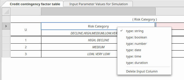 For the simulation to work it is critical to set the data type for all Input and Output Clauses. Range, gap and overlap validations are supported for clauses of type 'number', but validation cannot be performed if the type has not been specified.  Code Generation for typed languages such as C++, C# and Java requires that the data types are specified.  When the data type is specified as 'string', there is no need to enclose each string literal within quotes. String values are displayed using italic font if the type has been declared.