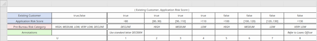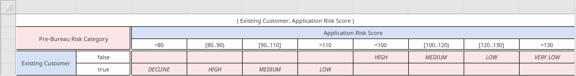 Rule-as-Crosstab format, where the rules are formed from inputs defined as a set of rows AND a combination of columns, with outputs set in the intersecting cells. (Note that this format hides the 'Annotation' fields):