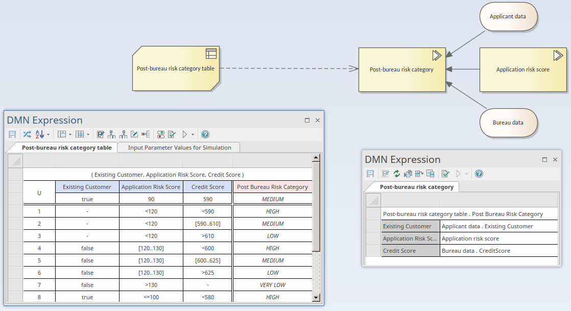 - The Decision 'Post-bureau risk category' is the target of three Information Requirement connectors from two Input Data elements and one Decision element
