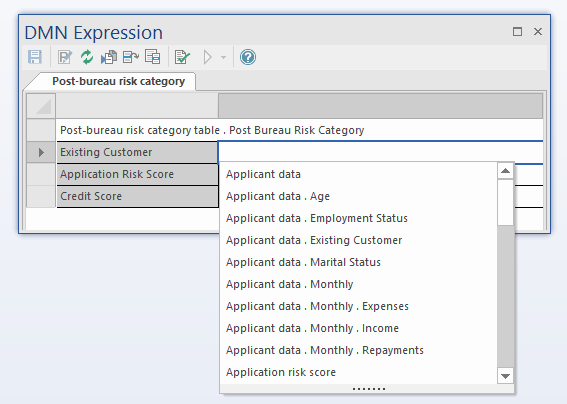 When an Invocation is selected, a number of facilities for working on it are accessible from the toolbar of the DMN Expression window: