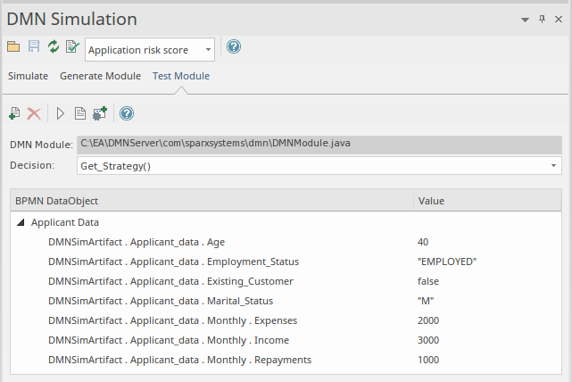 Important: This 'Test Module' step is recommended before integrating DMNServer.java with the Enterprise Architect BPSim Execution Engine. See the Integrate a DMN Module Into BPSim for Simulation Help topic.