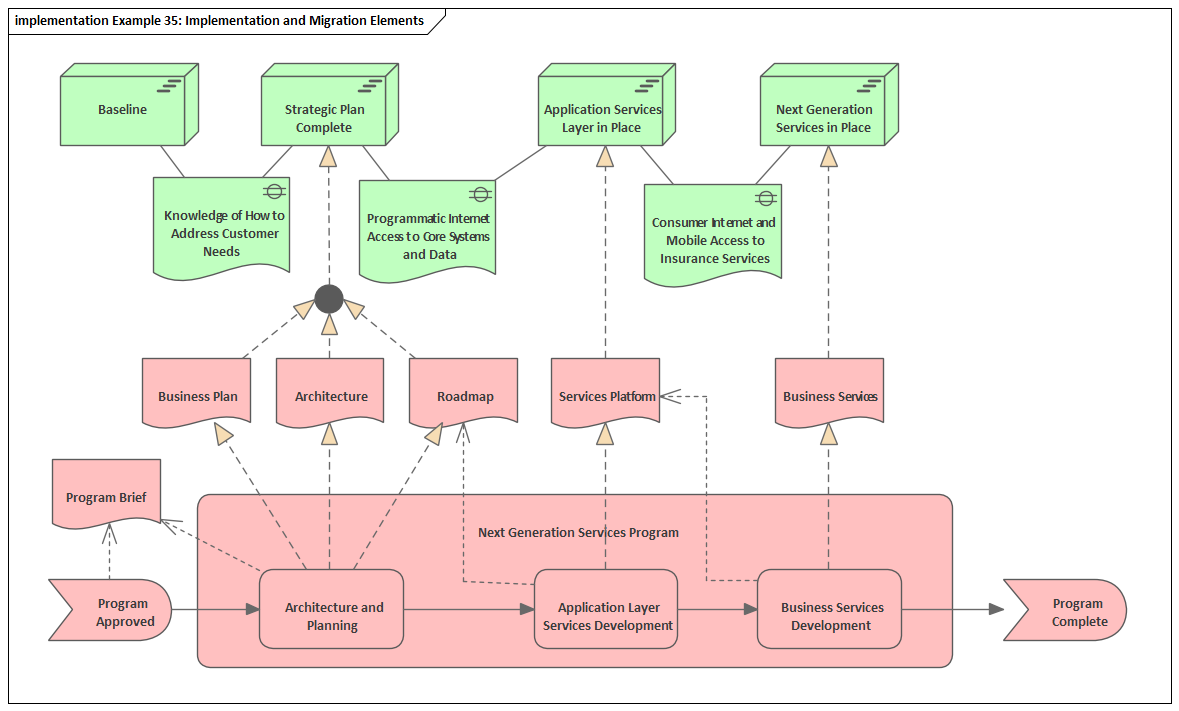 Figure: Example diagram from the ArchiMate Specification, showing Plateaus, Gaps, Deliverables, Work Packages and Events.