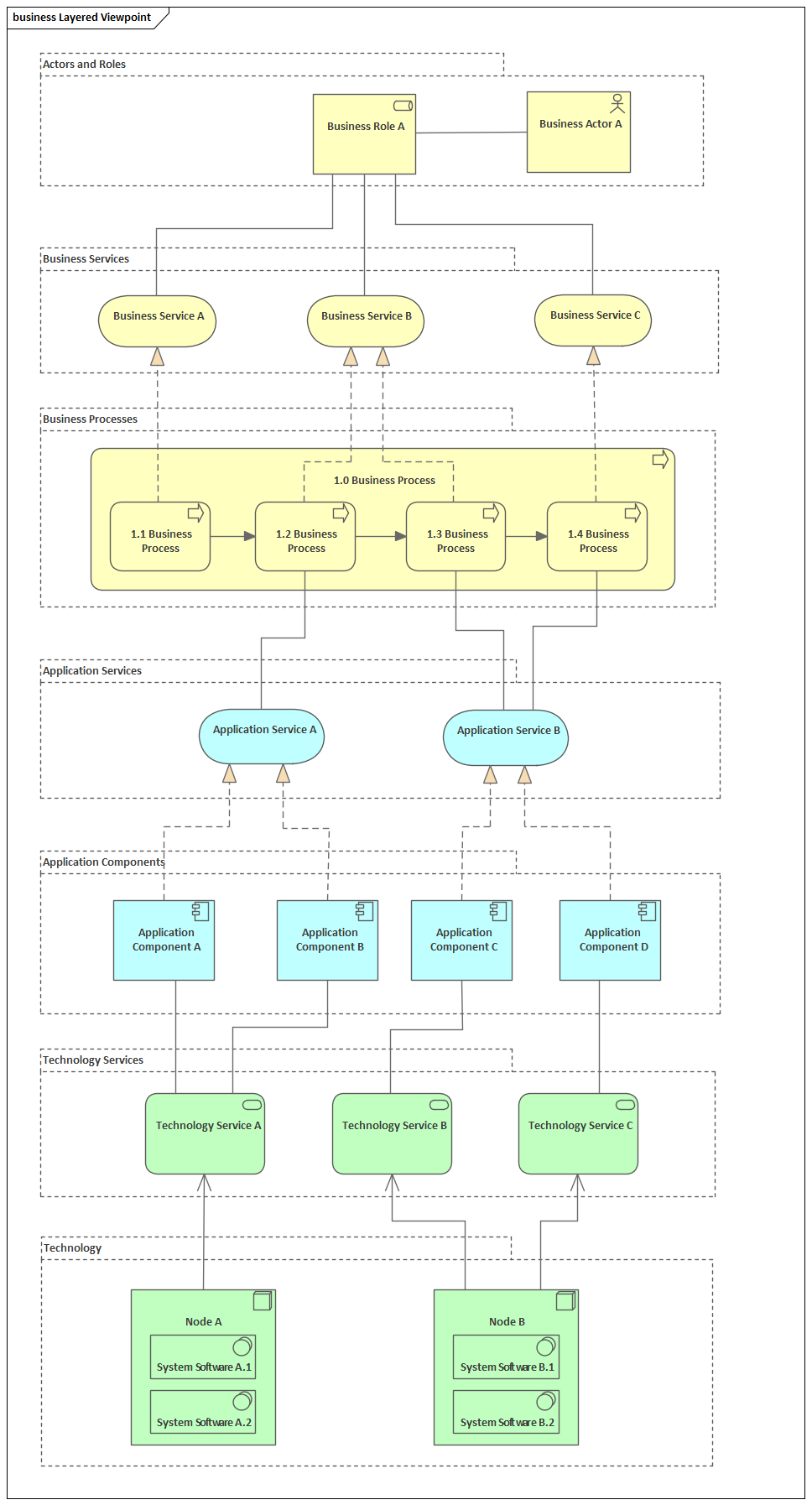 The Layered Viewpoint pattern creates a number of elements and diagrams that allow the visualization of multiple layers of an Enterprise Architecture in a single diagram. The partitioning which uses the Grouping element allows the representation of elements such as Business Processes in dedicated layers and elements such as Application Services in services layers. Any number of layers can be included but the diagram is most expressive when dedicated and service layers are interleaved.
