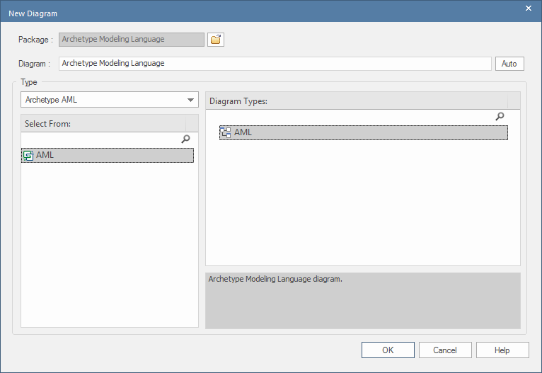 This image illustrates the selection of the 'AML' diagram type in the 'New Diagram' dialog.