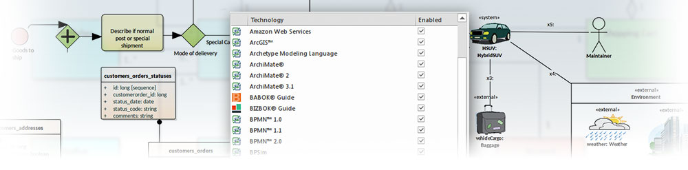 You can create expressive and industry-compliant models of business, technology, or engineering systems using Enterprise Architect's built-in support for a range of modeling languages. You can articulate the different models, allowing visualizations such as how strategic models relate to Process models and how these are implemented by off-the-shelf or custom-built components and solutions. There is a formidable range of languages covering all aspects of business, technology, and engineering systems. The list of languages is always being added to as new standards are developed and includes, for example, the ability to model Artificial Intelligence (AI) and Machine Learning (ML) Cloud infrastructure in Amazon, Microsoft, and Google platforms.