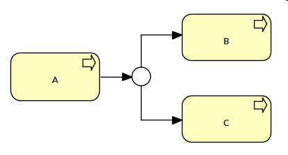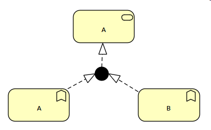 A junction is used to connect relationships of the same type to indicate that one (and only one) connector on the multiple side(s) of the junction will be invoked.