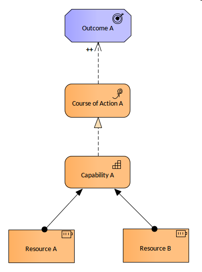 The Strategy Viewpoint pattern creates elements and a diagram that models the strategic intent of an organization by articulating a Course of Action and the Capabilities and Resources needed to achieve it providing a modeled Outcome.