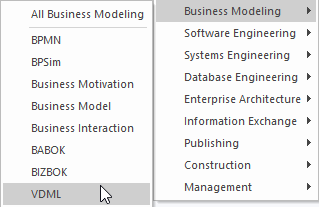You can create VDML diagrams and models using the diagramming and modeling facilities in Enterprise Architect. First you need to select the VDML Perspective. Perspectives are a facility that ensures you remain focused and can concentrate on just your area of work - in this case, VDML modeling.