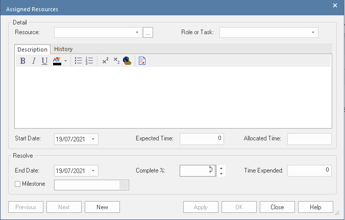 This dialog is also used to edit Resource Allocations entered previously through either the same dialog or the Resource Allocation window.