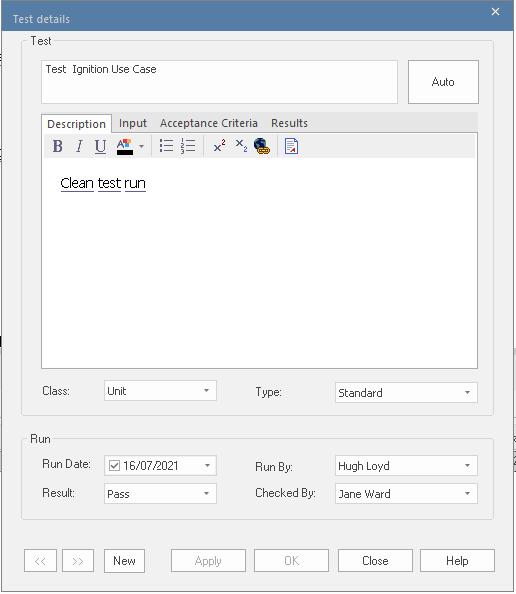 On the Test Cases window, double-click on the Test item to display the 'Test details' dialog