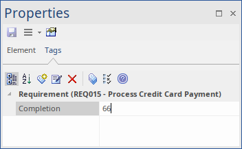 The Requirement element 'REQ015 - Process Credit Card Payment' is given a Tagged Value named 'Completion', with a value of '66'.