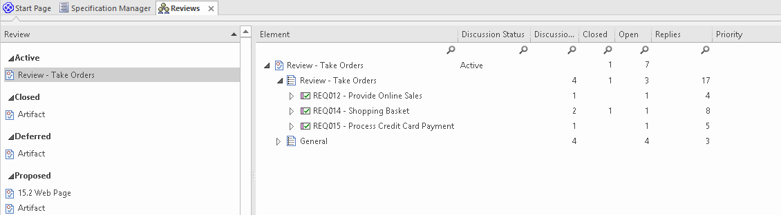 The Reviews view displays, showing the Review elements that exist in the model grouped according to their 'Status' value, in alphabetical order.