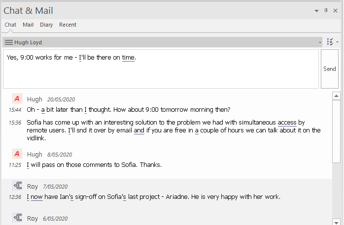 The 'Chat' tab on the Chat & Mail window provides an extremely useful facility of following and participating in quick conversations on a point of interest, with members of a selected user group. The user group can contain a number of users and is defined in User Security, which must be enabled in order for the Chat facility to be available.