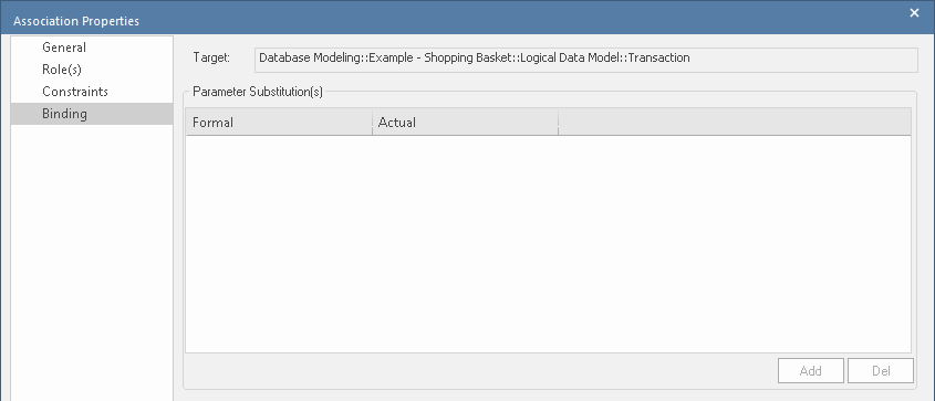 Template Binding connectors, and also Generalize, Realize and Associate connectors, have a 'Binding' tab on their 'Properties' dialog and in the Properties window. You use this tab to define binding expressions and parameter substitutions for the connector.