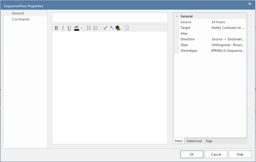 ('Properties' dialog, Optional) Type any comments you want to record on the connector. You can format the text using the Notes toolbar at the top of the field. These notes can be included in searches, reports and documentation, if required. |