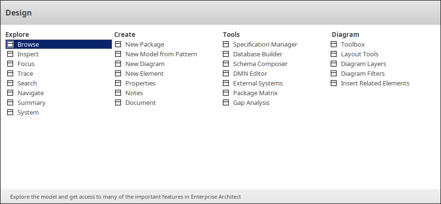 The Design Window Selector provides immediate access to a range of windows for locating, creating and working on objects on the model, including within diagrams. Each window name is a command that, when you click on it, opens that window.