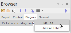 Conversely, you might have set a large diagram to open automatically when you log on to Enterprise Architect, and spend the whole session working on the elements of that diagram, so you could hide the 'Project' and 'Context' tabs, and just work on the 'Diagram' tab, and/or on the 'Details' tab of the Inspector window.