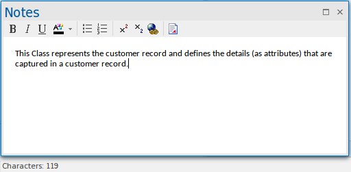 Many experienced modelers have the Notes window docked in the workspace, and when they select an entity in a diagram, the Browser window or another window, that object immediately becomes the focus of the window and they can view, create or edit the notes. Conversely, if you have limited screen space and do not want to keep the Notes window open all the time, you can display the Quicknotes window, which is a simpler version of the Notes window without the toolbar. You can still format the text using context menu options. The Quicknotes window closes when you click outside it.