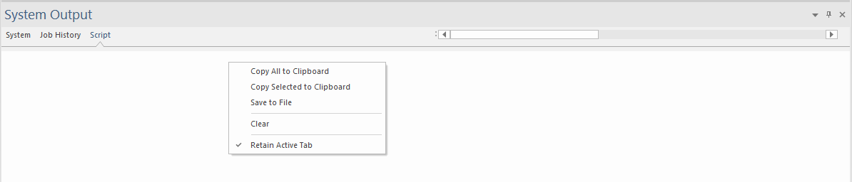 The System Output window is used to display information generated by internal Enterprise Architect processes, or by Add-Ins and other third-party tools. The output from each type of operation is generally displayed on its own tab within the window. The System Output window can provide useful information during long-running processes and batch operations; through this window you can, for example: