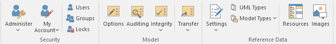 The 'Settings' ribbon is used for managing the way a repository is used, from setting up reference data, security and Version Control to audits and integrity checks. Enterprise Architect is a flexible platform and can be configured to suit any enterprise, business or technical team.