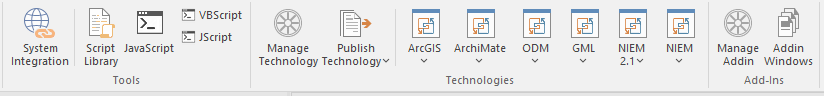 The contents of this ribbon therefore depend on what Add-Ins and Technologies you have installed and enabled, and whether they have been assigned to a particular functional area of Enterprise Architect.