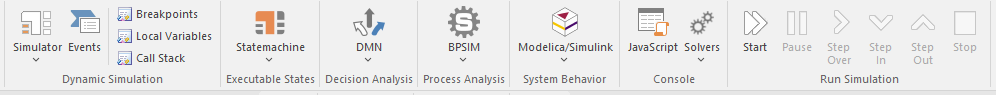 The 'Simulate' ribbon presents a range of tools for configuring, building and running simulations of models, in particular models of executable states, decision analysis, business process analysis and system behavior. The definition of a simulation is further supported by the facility to create JavaScript to control a simulation, including the use of mathematical solvers such as MATLAB and Octave.