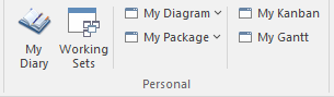 The 'Personal' panel provides options to maintain work area settings that are specific to your login, such as your daily diary, your working sets - groups of windows, diagrams and views to return to as a set in later work sessions - your user default diagram, your default work Package, your Gantt Chart listing your work allocations, and the Kanban diagram you have set as your personal default.