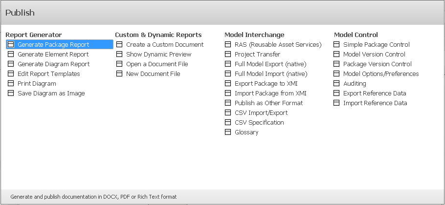 Use this command to generate a report on the currently selected Package. The 'Generate Documentation' window will be displayed, using the current Package name as the default output filename. This window is used to select the report template, style-sheet and cover page. It also allows you to specify a range of filters and other options that will affect the generated report. |