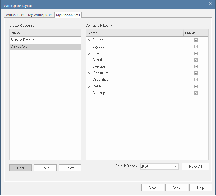 Start > All Windows > Workspace > Workspace Tools > My Ribbon Sets |