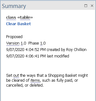 The Summary window shows a brief, read-only summary of the general properties of the currently selected: