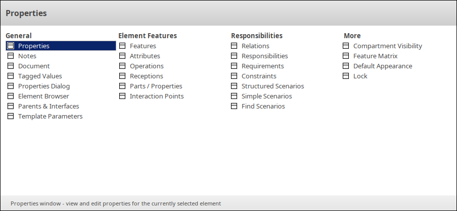 The Properties Window Selector provides immediate access to a range of windows for creating, examining and working on the properties of objects in the model, both from the Browser window and in diagrams. Each window name is a command that, when you click on it, opens that window.