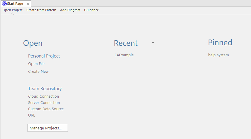The Start Page is the default landing page that displays when you first open Enterprise Architect. It provides a range of useful tools to: