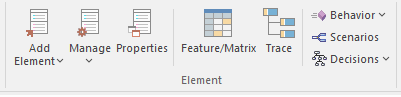 The 'Element' panel provides facilities to manage elements, which are the building blocks of models. Elements can be created and specified with attributes and operations. You can also define scenarios for the activities that the element represents.
