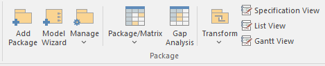 The 'Package' panel provides facilities to create and manage folders (Packages). New models can be added that typically contain a number of other Packages. These Packages form the structure of the model and can be used to group elements, diagrams or other Packages. A Package can also be viewed as a list of elements that will include other Packages, or as a Gantt chart describing the allocation of resources to the elements in the Package.
